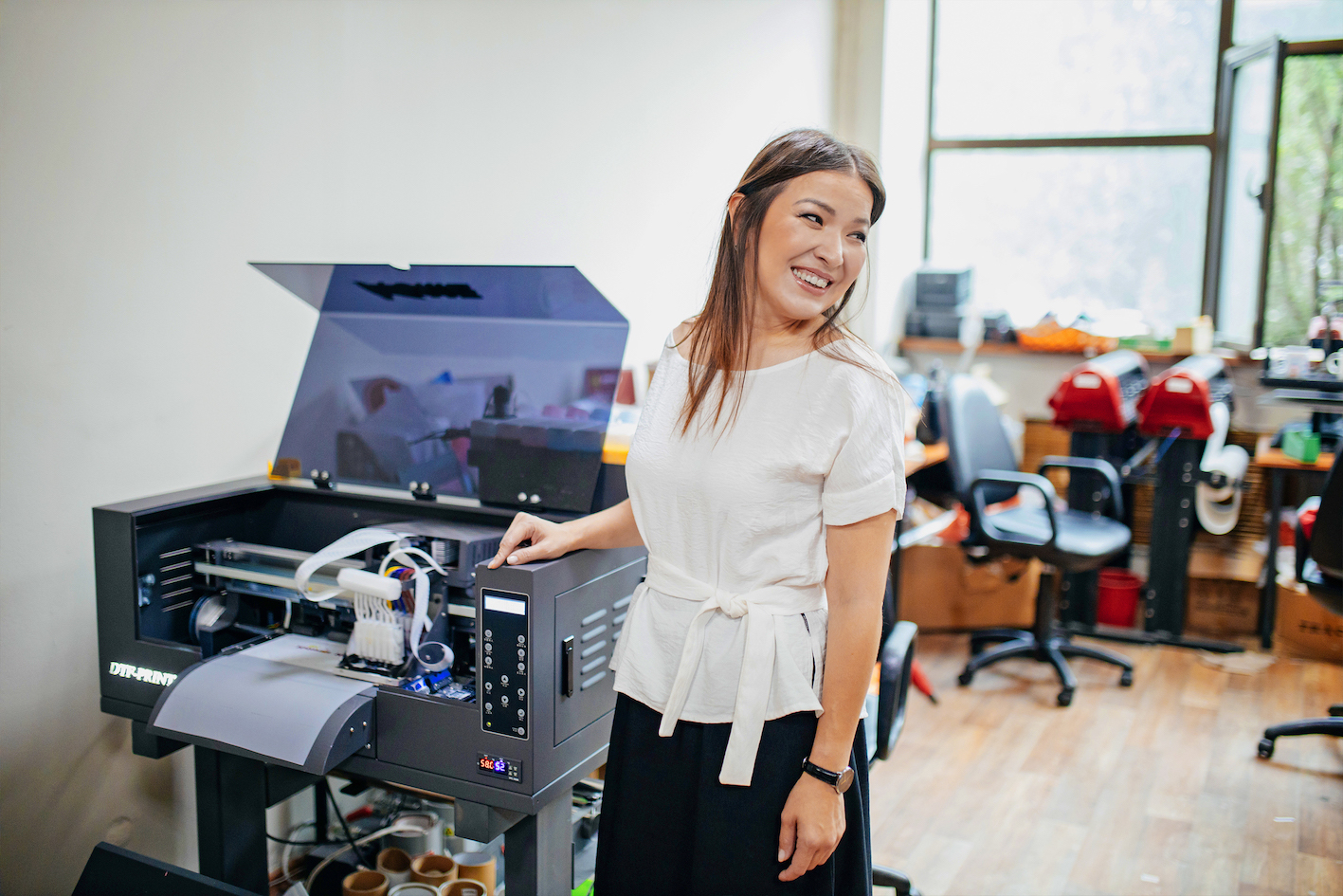 Мен дайын бизнесті сатып аламын деп шештім. Сөйтіп, 2018 жылы сауда орталығындағы фотосалонды сатып алдым. Соның арқасында өніммен жұмыс жасаудың басқа қырларын таныдым. Мысалы, текстиль, тәрелке, төсбелгі және тағы сол сияқты нәрселерге сурет пен жазу түсіретін жабдықтармен жұмыс істеуді меңгердім. Техникаға әрдайым керек-жарағын алып, үнемі күтіммен қарау керектігін түсіндім.